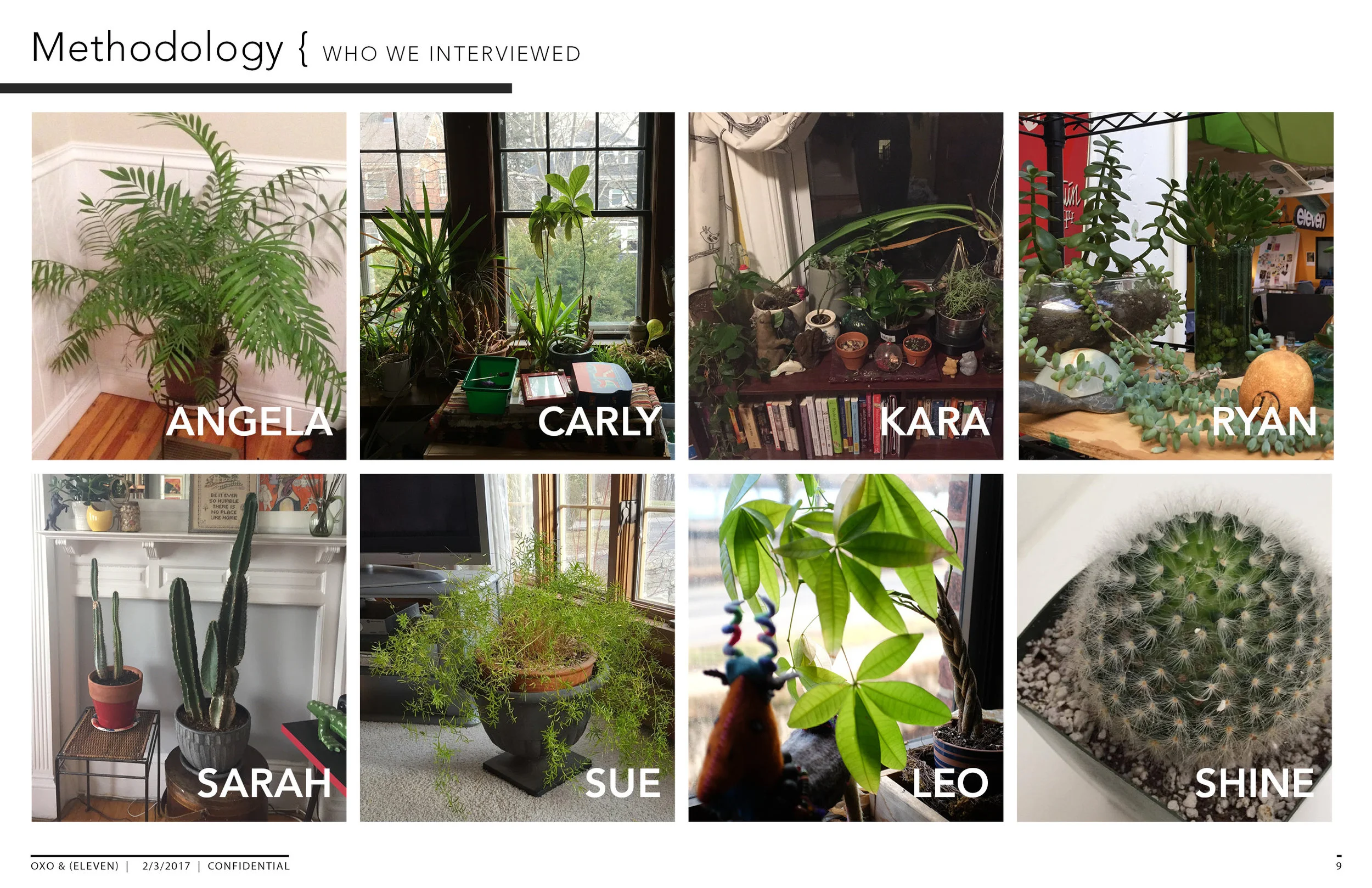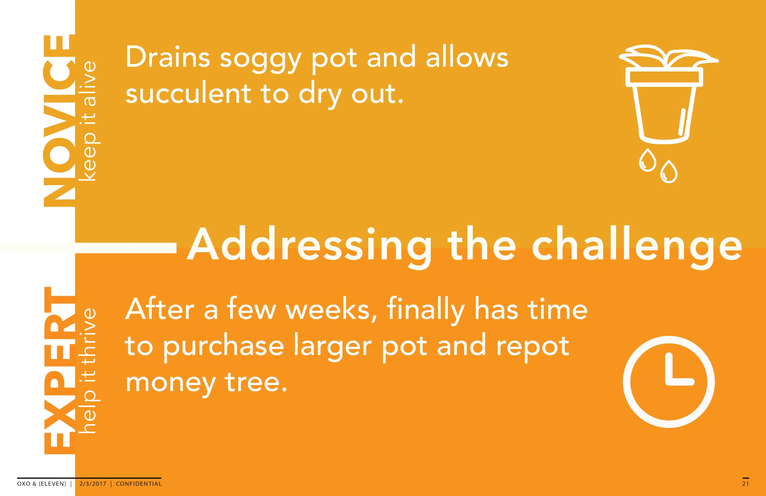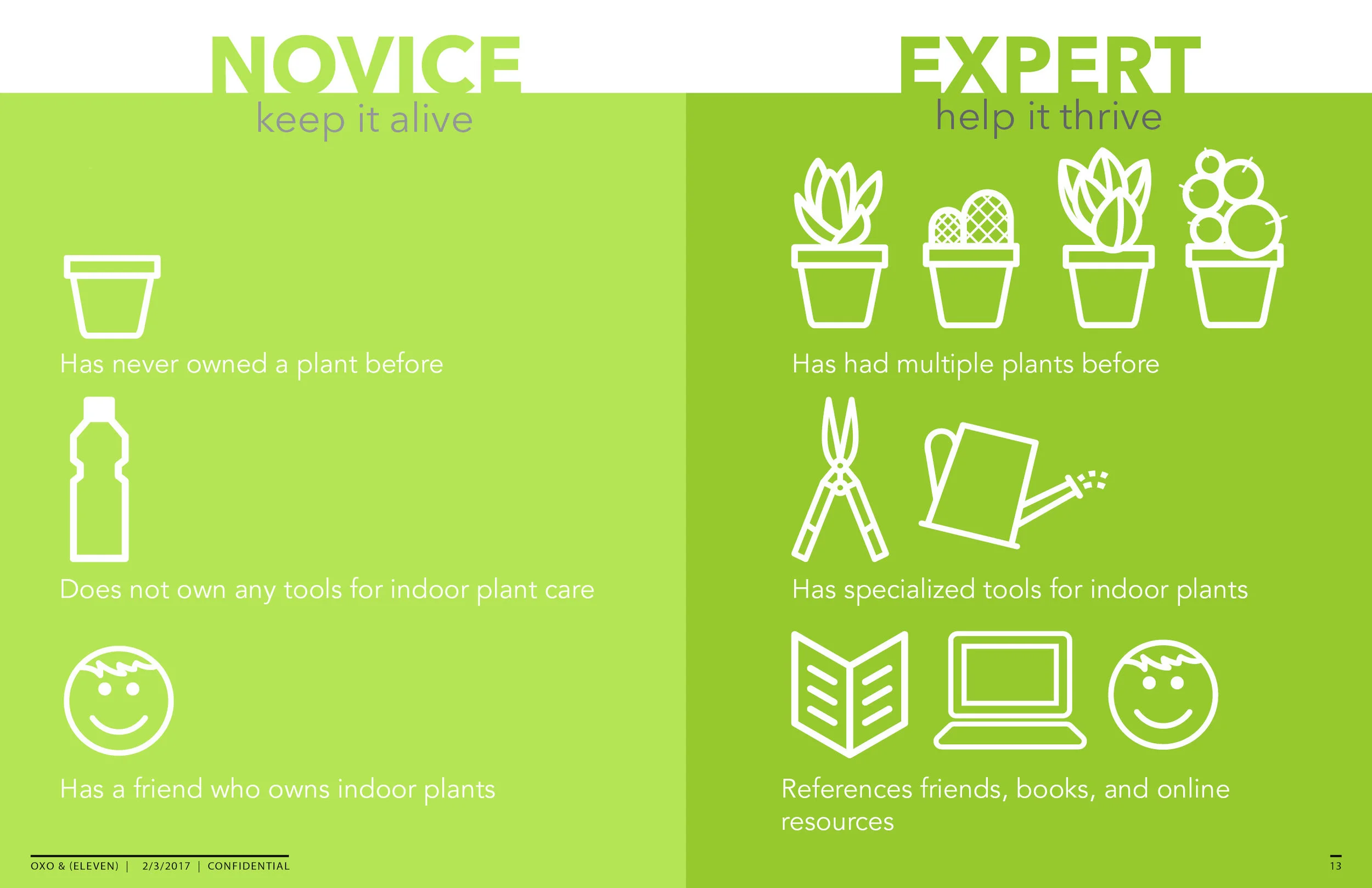 I had two weeks to complete this research project, and had access to limited resources. In order to gain a useful and in-depth understanding of the relationship between people and plants, a survey and interview approach was used. The surveys allowed for a broader audience response, while the interviews provided more depth to people who valued their relationship with their plants. Using the 35 responses from the online survey and 8 interviews, I turned the findings into a journey map representative of two different personas with different experience levels with plants. With entire process in mind, I delved into market research to identify spaces where I believe OXO products would be successful, based on their current product line, company branding, and material/manufacturing capabilities.